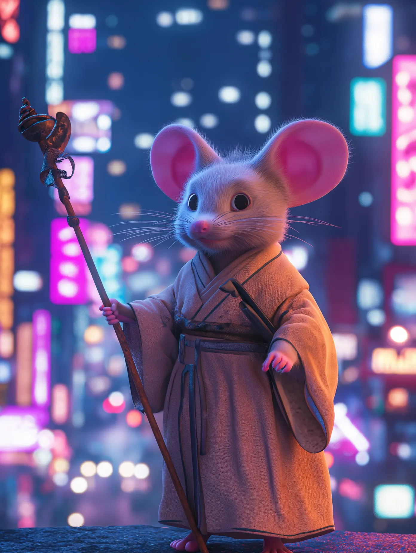 Zodiac cute mouse, 3D Pixar character style, 3D model, front view, character design, standing between skyscrapers in nighttime Seoul. The background is a vibrant urban cityscape with neon lights and glowing buildings. The Rat wears monk-style robes, simple yet sacred, flowing with spiritual elegance. It holds a magical staff infused with ancient runes. Its face is adorably sly, with a mischievous, slightly wicked smile. The character is larger than the buildings, standing out as a mythical figure. Fantasy meets modern city, cinematic lighting, high detail, dramatic contrast." --ar 3:4