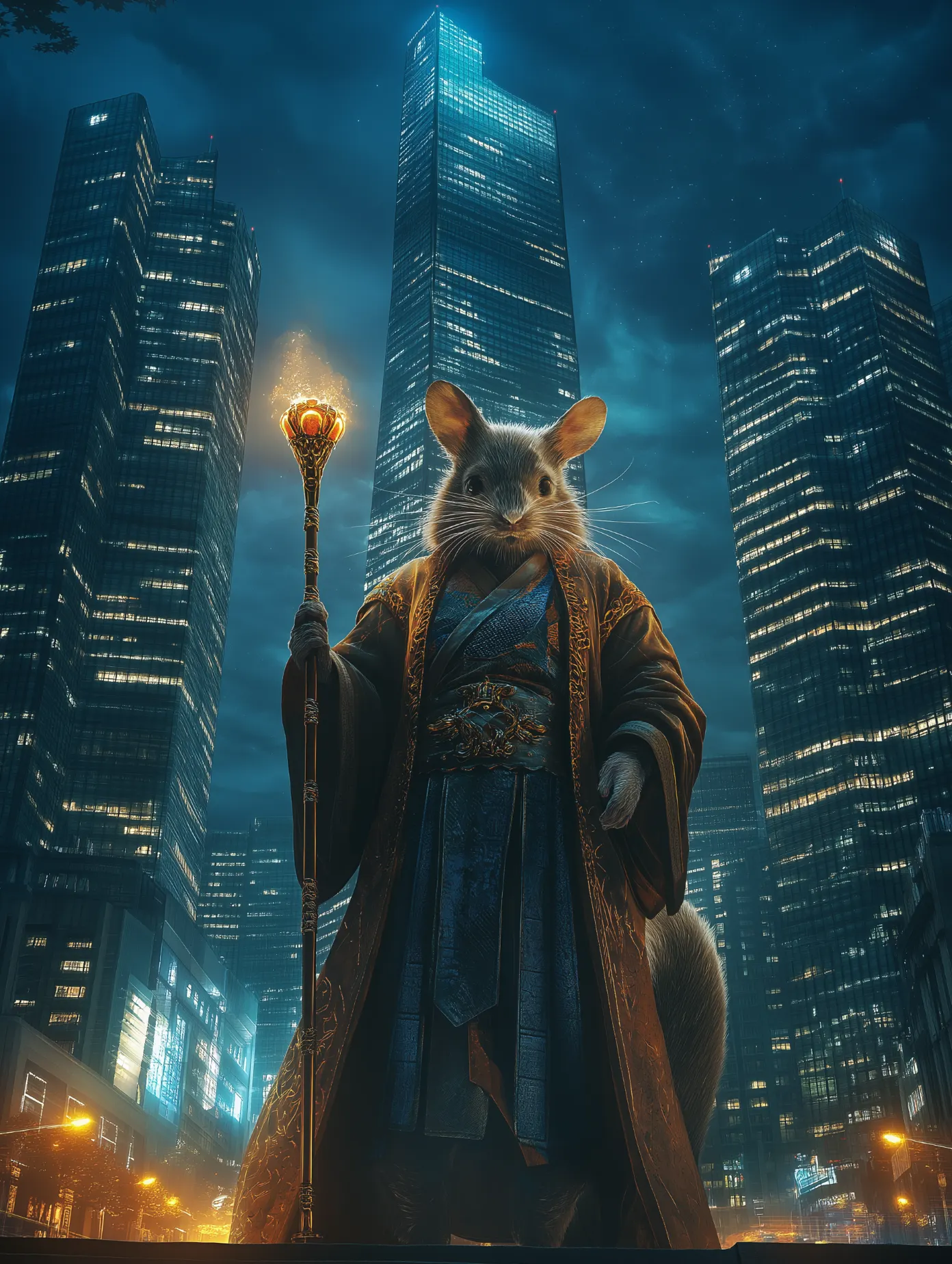 Prompt : A zodiac rat character standing between Seoul city skyscrapers at night. The character is larger than the buildings, wearing mythological-style robes, holding a wizard staff. Its face is cute but mischievously grinning. Magical and cinematic lighting, fantasy atmosphere, ultra-detailed, dramatic city nightscape in the background.