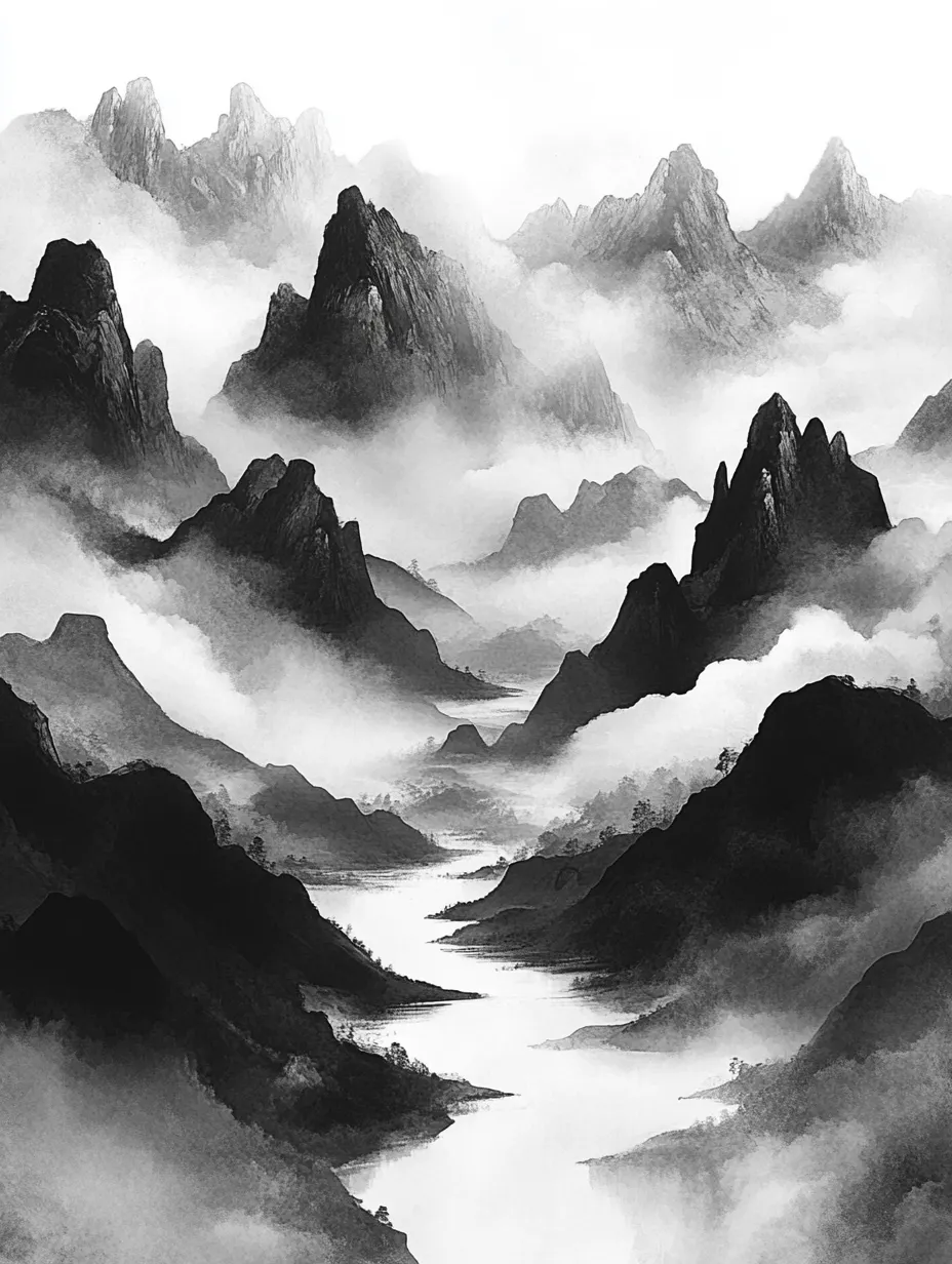Prompt: Asia ink landscape in black and white, traditional landscape painting style, cloudy mountain peaks with black ink wash, flowing river, minimalist negative space, symmetrical composition, 8k ultra-detailed