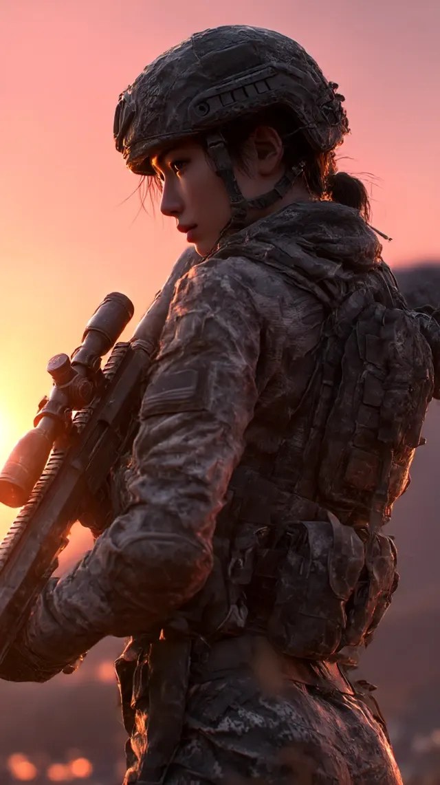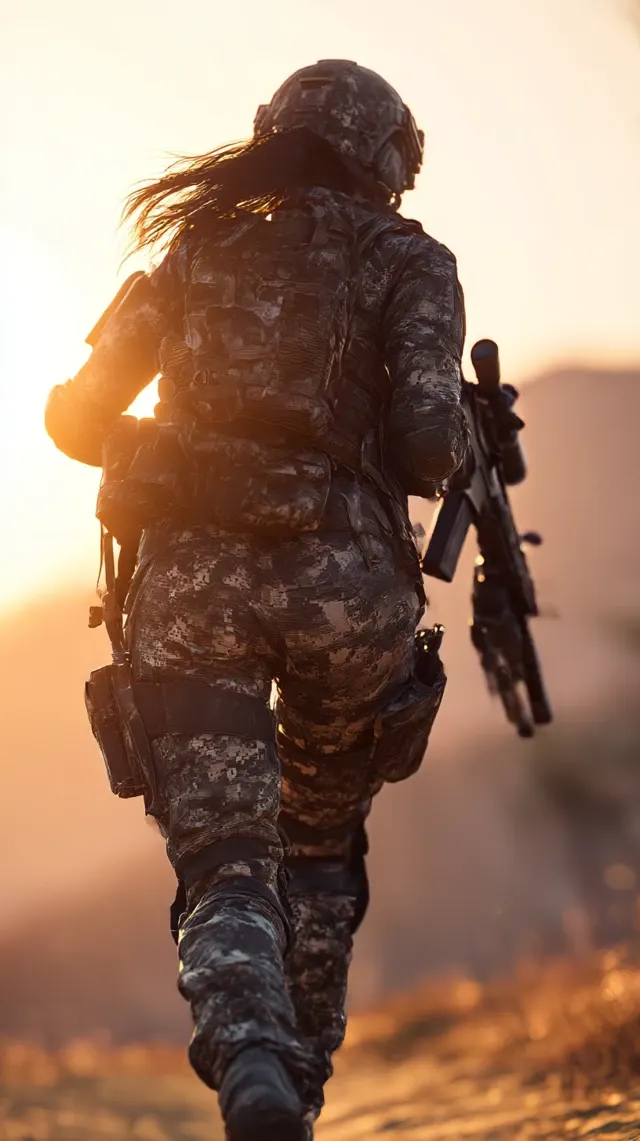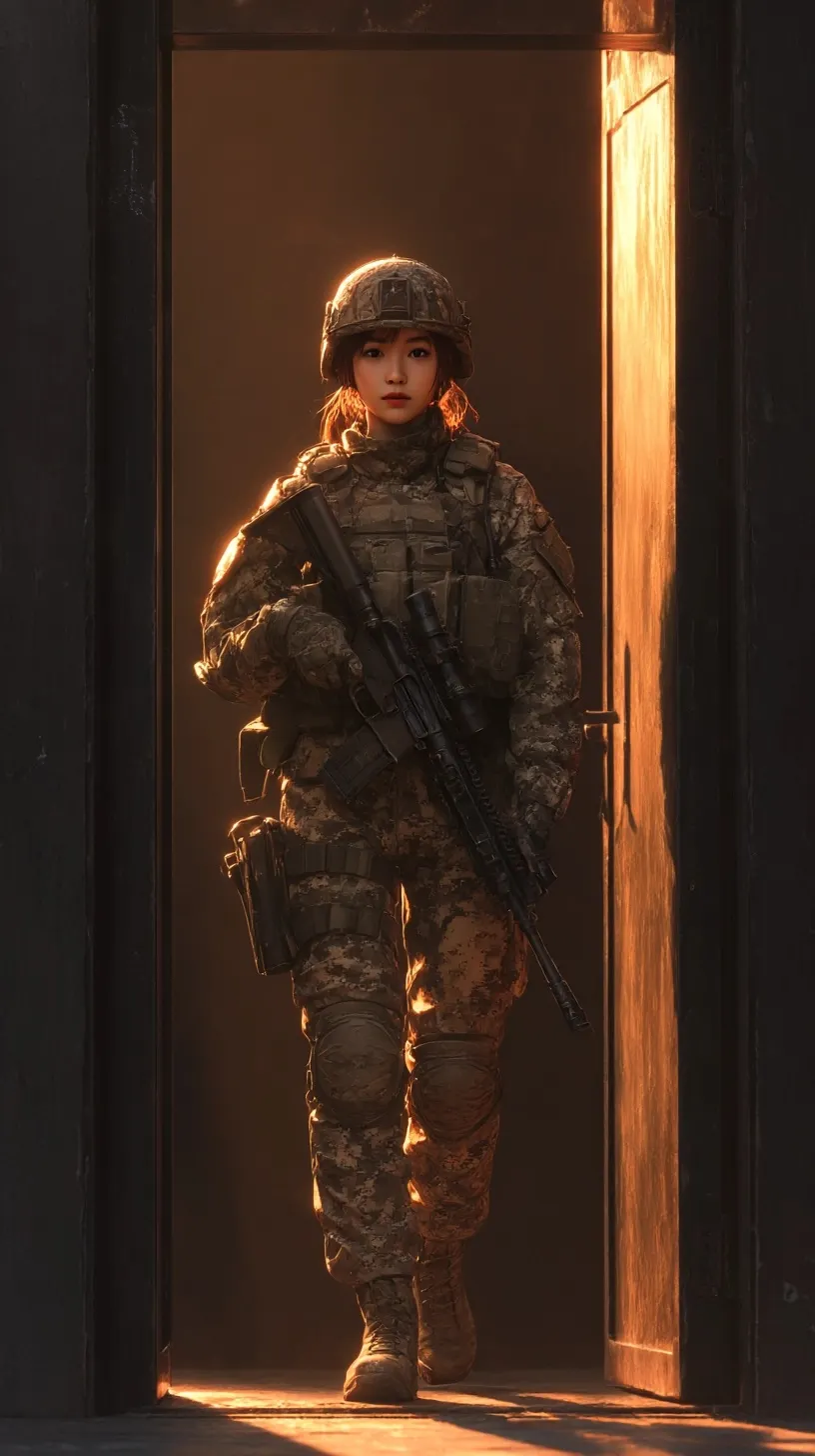 The same door creaks open again. Now, a Korean female soldier steps out in full tactical camouflage. Her rifle is held steady, posture low and sharp, expression calm but fierce. The setting sun hits her gear as she advances toward her mission. The city is gone — replaced by blurred terrain and tension in the air.