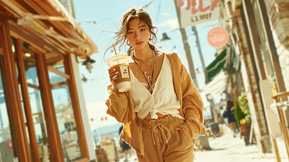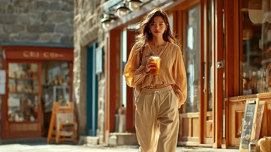 카메라는 해질녘 조용한 도시 거리를 걷는 젊은 한국 여성의 뒷모습을 따라간다. 그녀는 네이비 블루 색상의 플로럴 민소매 원피스와 흰색 운동화를 착용했다. 포니테일 머리가 자연스럽게 흔들리며, 도시 전체는 따뜻한 황금빛 햇살에 물들어 있다.